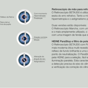 O HEINE BETA 200S é um oftalmoscópio direto premium com óptica asférica de alta definição e LED HQ. Seu design robusto e livre de manutenção combina precisão clínica com ergonomia superior, ideal para profissionais que demandam confiabilidade no diagnóstico. Com 28 lentes em disco Rekoss e sete diagramas de exame, adapta-se a múltiplas condições oculares.